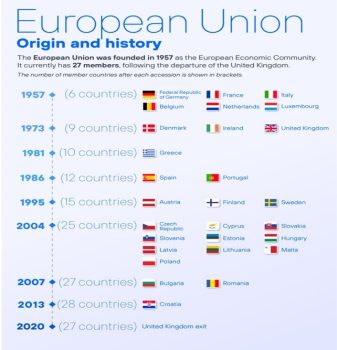 Dai sei membri fondatori agli attuali 27 stati membri, ci sono state sette occasioni in cui nuovi membri hanno aderito all’Unione dopo la sua fondazione e solo una in cui un membro ha abbandonato l’Unione.